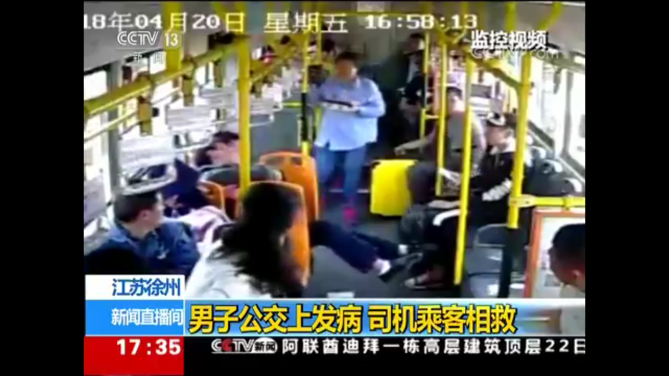 4月20日下午4點58分,26路自編號5025車從徐州開往賈汪途中,一名坐在車中間座位上的男乘客突然倒在了旁邊乘客身上,口吐白沫,渾身抽搐打著哆嗦,情況十分危急。乘務(wù)員昝昱安和周圍乘客立即上前查看,駕駛員耿德志也急忙停下車趕來。