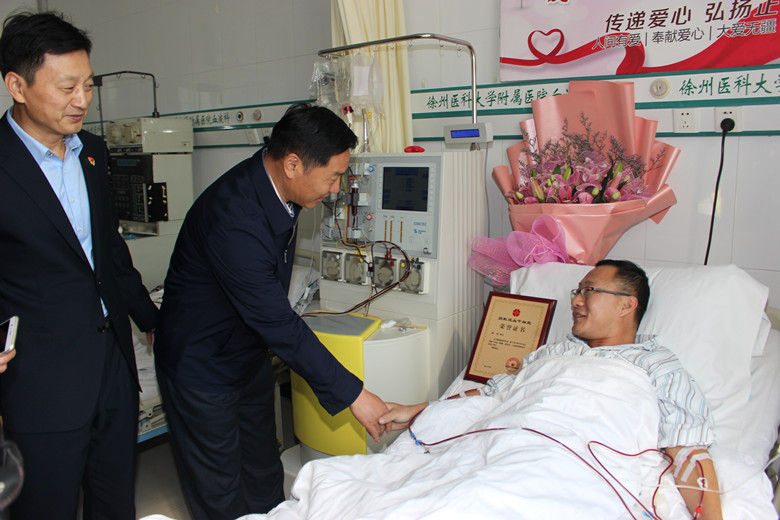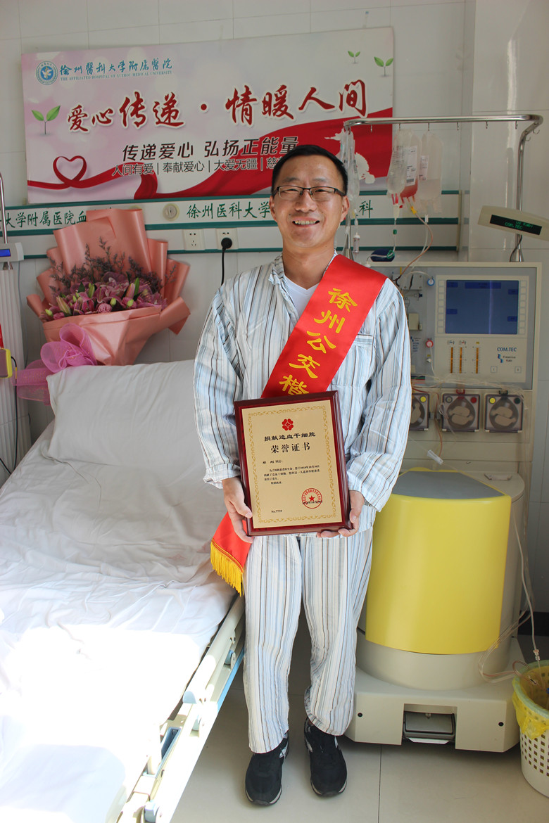 打過8針造血干細(xì)胞動員劑,10月30日上午開始采集?!袄习?,加油!”兒子在病床前給鄭剛鼓勁兒,雖然經(jīng)過了幾天動員針的不適反應(yīng),此時鄭剛依舊很堅定:“我比別人的打針反應(yīng)大,只要能救人一命,這都不算啥,我現(xiàn)在就希望孩子能盡快康復(fù)。”徐州市紅十字會副會長李永衛(wèi)為鄭剛頒發(fā)了“捐獻(xiàn)造血干細(xì)胞榮譽證書”,為他點贊:“你是英雄!”患者家人在感謝信中寫道:“您這種高尚的壯舉給了我們?nèi)疑畹南M!?/span>